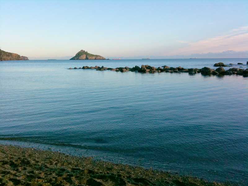 Roughly in the centre of the beach is a rock half-circle as seen here at low tide: