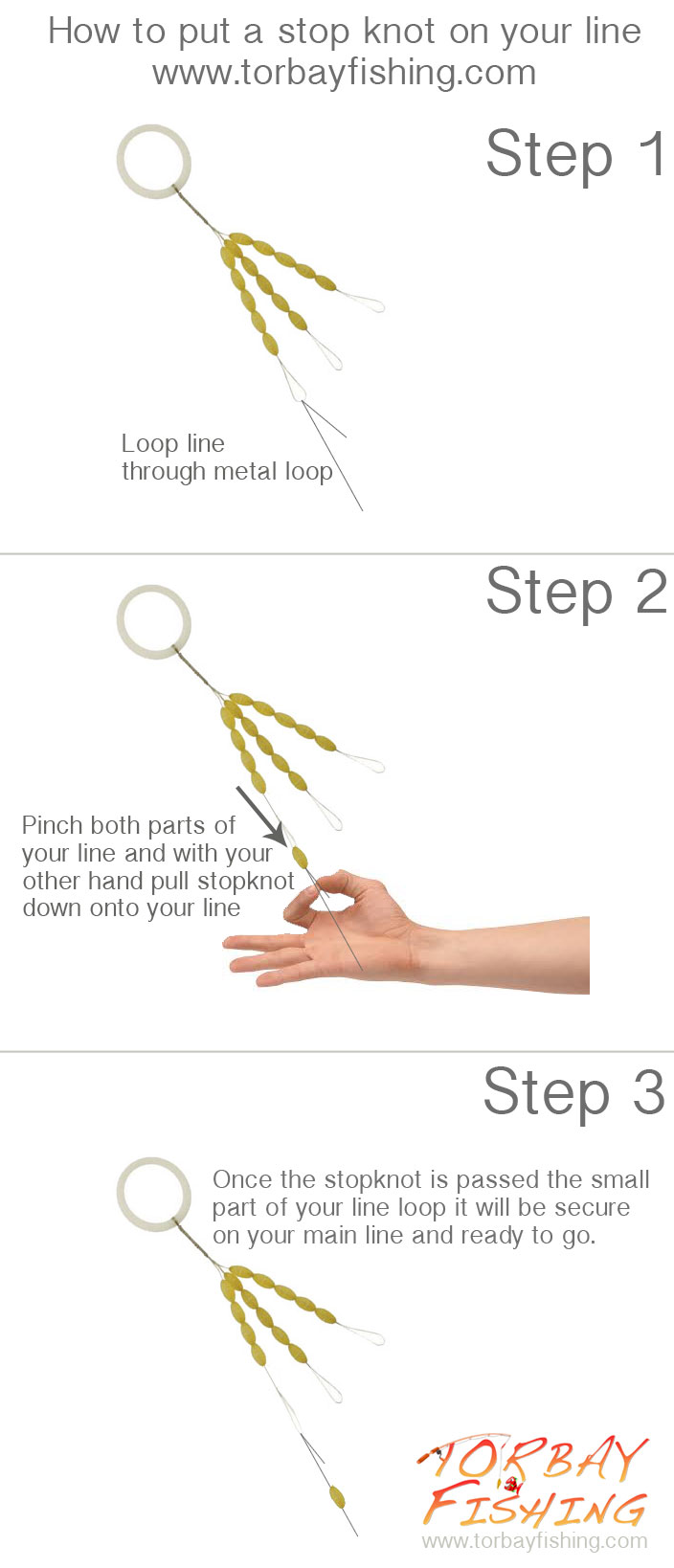 First thing you need to do is add your stop knot. A stop knot is needed to prevent the bait sinking to the bottom. I'm going to cover this detail before we get to the rest of the set-up…
